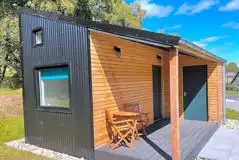 Glamping pods with a double bunk bed, an equipped kitchenette with a microwave oven, hob, fridge, freezer, toaster, kettle, and crockery. There's an ensuite toilet, shower, and wash basin. Heating and bedding are included.