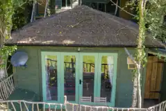 Tree house with a double bedroom, a twin bedroom, and a large sofa bed. There is an equipped kitchenette, a dining area, a TV, DVD player, and electric heating. Outside, a private deck and BBQ. Shared facilities are nearby.