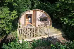 Glamping pod with convertible seating for a double bed and a small kitchenette. Outside, enjoy a covered deck with seating and a private BBQ. Shared facilities are nearby.