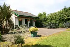 A traditional camper's cottage with an open fire and outdoor seating.