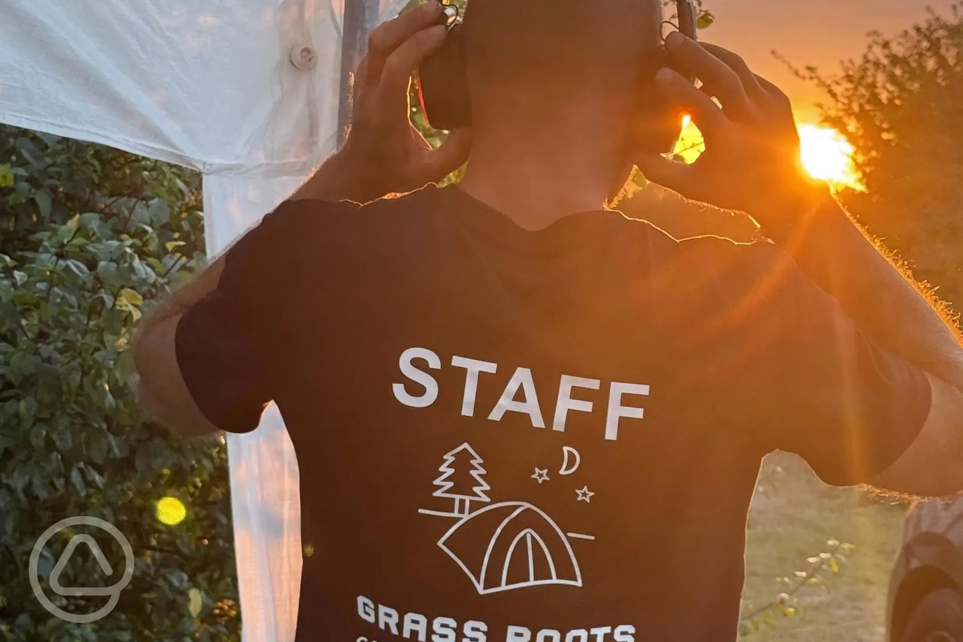 Unmarked grass pitches without electric, suitable for roof tents, campervans, caravans and motorhomes. Can pitch anywhere towards the left hand side or back hedge row on the field