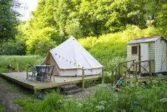 Short Eared Owl is a five metre, fully equipped bell tent. Set on a large decked platform with individual furnishings to dine and relax outdoors. Including private bathroom facilities with composting toilet and eco washing.