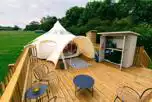 Lotus Belle tents with a double bed, a single foldout bed and a single futon, bedding included. Complete with a camp kitchen, wood burning stove, a fire pit with a grill and a picnic bench. Dogs welcome. Shared facilities nearby. Maximum of two adults.