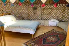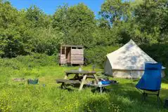 6m bell tents with plenty of space and furnished with double bed, gas stove, BBQ and equipped with crockery and cutlery. Each sleep a family of five. Please bring your own bedding. Private ensuite compost loo, hot shower and washing up sink under cover.