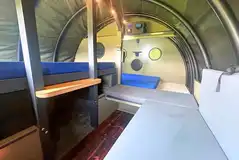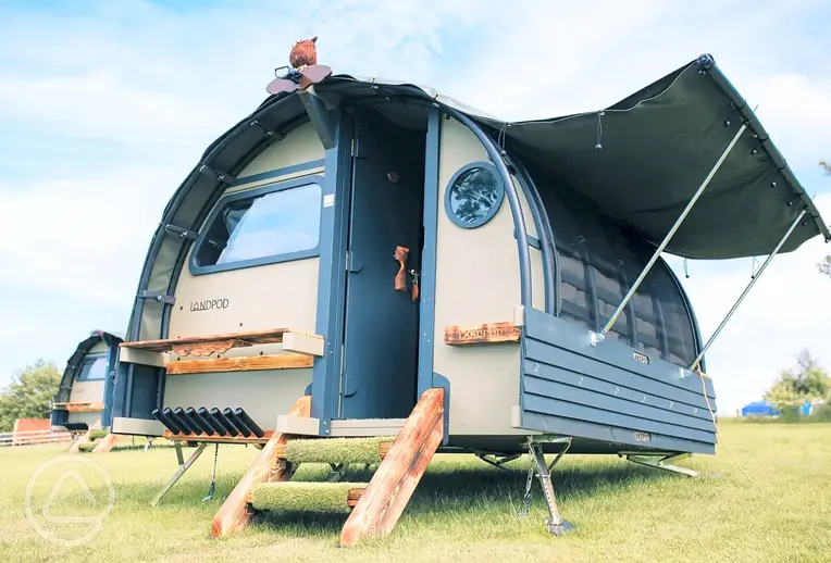 A Landpod with a double bunk bed, dining area with table, wood burning stove, kitchen corner, iPod dock, a BBQ and a fire pit. Shared facilities are nearby, and there is space to park a car. Please bring all camping equipment, minus the tent.
