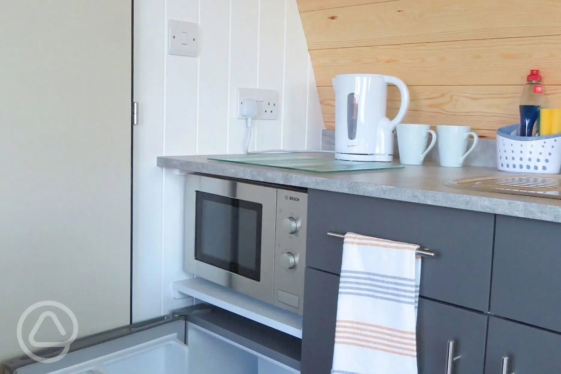 Luxury heated pods with ensuite toilet and shower, double bed, WiFi and Smart TV. Cooking utensils include microwave, oven and fridge plus crockery and cutlery. Single bed can be added if bringing a third person. Please bring own bedding and towels.