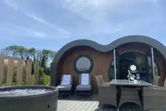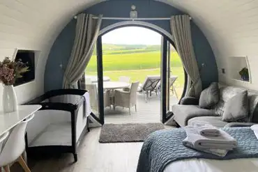 Open plan ensuite pods with a king size bed and bunk beds. The kitchen has a twin induction hob, kettle, microwave, toaster and small fridge. There's a living area with sofa and smart TV and outside there's a private terrace and hot tub. Bedding provided.