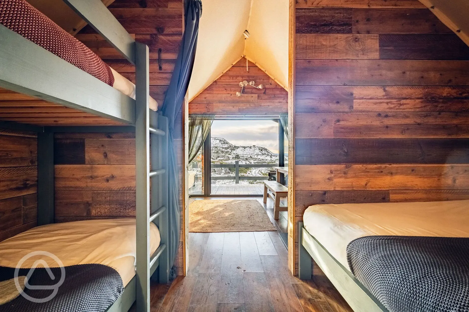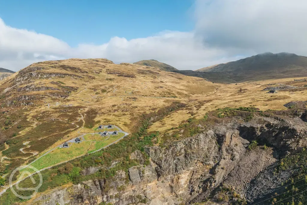 This adventure glamping option offers a beautiful location in a rugged landscape filled with amazing views and extraordinary industrial heritage, just five minutes from the historic town of Blaenau Ffestiniog. The tents combine the traditional aesthetic features of a tent, with the integrity and warmth of a cabin. A destination for adventurous visitors looking for somewhere comfortable to stay, the tents are situated on a spectacular, steep hillside overlooking the moorland, valleys and historic quarries of Blaenau Ffestiniog. The six tents sleep four or five people and include all you need. They are fitted with insulated wooden walls to cocoon you from the elements. You can experience all the comforts of home - from solid wooden floors, comfortable and welcoming beds, to showers and flushing toilets. There are even places to charge your phones, laptops and GoPros, and a cosy wood burner. These Glamping Tents are right at the heart of North Wales' most exciting tourist attractions - handy for exploring Eryri (Snowdonia) (40 minutes), Zip World (2 minutes) and Antur Stiniog (2 minutes).