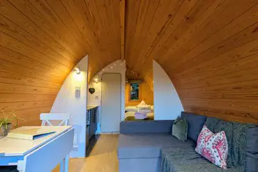 Your pod is fully equipped for a relaxed luxury getaway, featuring a comfortable double bed, sofa bed, private en-suite wet room and a well-appointed kitchenette. Bed linen, towels, toiletries and all essential kitchenware are provided for your convenience. Enjoy cosy evenings outdoors with your own chiminea, complete with kindling, matches and a firelighter. Additional logs and charcoal are available to purchase on site. The site also offers an indoor games shed for all ages, and pets are welcome by prior arrangement (surcharges apply).