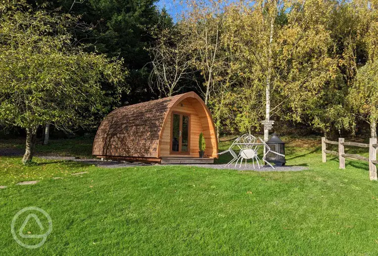 Luxury glamping pods, with thermostatically controlled underfloor heating, an en-suite wet-room with shower and toilet, a kitchenette with a kettle, toaster, microwave, fridge and induction hob. Complete with a private chiminea (BBQ) and outdoor seating.