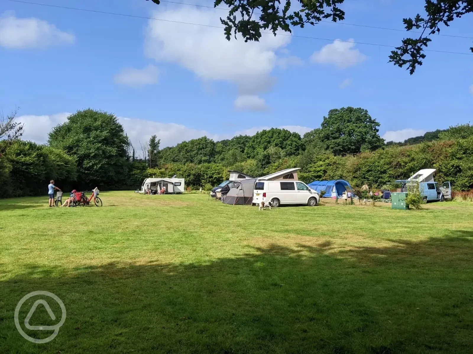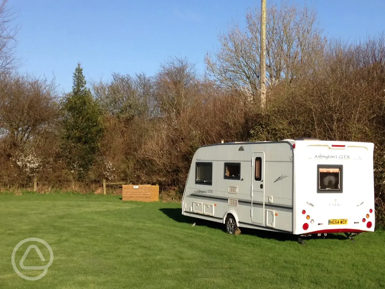 Large grass pitches with electric hook up. Suitable for tents, caravans and tourers.