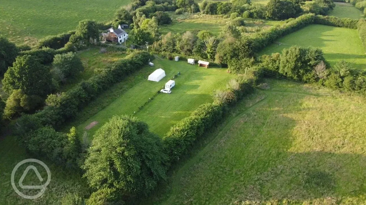 This picturesque rural campsite is a lovely choice for families or couples looking to escape everyday life, set close to the River Thrushel and Tinhay Lake. Fishing permits can be purchased from the Arundell Hotel in the village of Lifton, which is 15 mins walking distance. There are ten tent grass pitches and five caravan/motorhome grass pitches. The small pitches allow tents only and the large pitches allow larger tents, caravans, motorhomes, campervans and rooftop tents. The campsite is level and all grass. There are no separations between the pitches. Enjoy a campfire in the communal fire pit and have a BBQ. Perhaps you'd like to meet and feed the resident sheep or give the campsite cat cuddles. Homemade jam and honey is available to buy as are eggs when the hens are laying! Explore the surrounding countryside, walk along the lane to see the famous "Nearly There" trees or visit the Dartmoor National Park just 20 minutes away, don't forget to say hello to the famous free-roaming Dartmoor ponies! The coast is just half an hour's drive away and is great for a day's outing or for a gentle evening stroll. The historic towns of Okehampton, Launceston and Tavistock are all within a 20 minute drive. There is very little light pollution here and so stargazing on a clear night is a treat. Just remember to wrap up warm! Dogs are welcome onsite, just please keep them on the lead in the areas requested. Fire pits are allowed, provided they are raised off the grass, and firewood is available onsite.