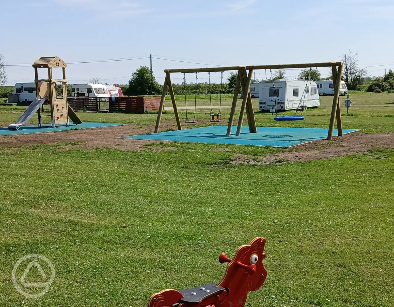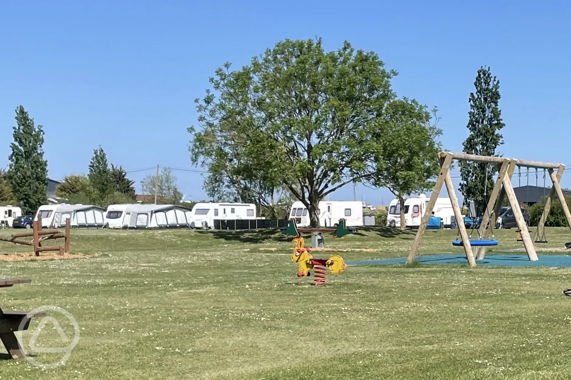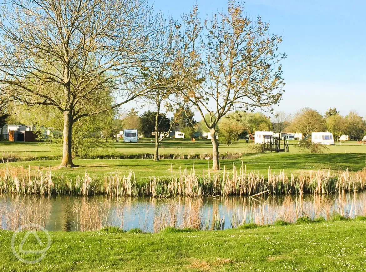 Spacious grass pitches stretching over a five acre field, with an optional 16amp electric hookup.