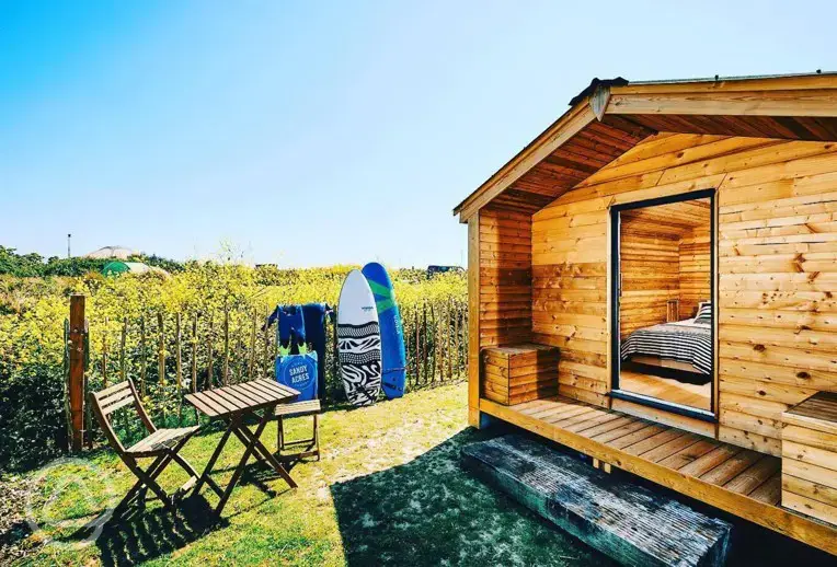 A rural 170-acre campsite backed by grassy dunes and overlooking a secluded sandy beach, just ten minutes from Godrevy and Hayle. The site is ideal for explorers, adventure goers, families and couples, with direct access to the South West Coast Path and St Ives Bay. With an onsite surf school personalised to your abilities and taught by qualified instructors, plus a range of private lessons, you're sure to make lasting memories and enjoy an exhilarating time riding the waves. Tents, campervans and smaller motorhomes can choose from non electric grass pitches in small, standard, supersized and beach-view options. Glampers can opt for two-person beach pods, equipped with a king bed or two singles plus bunk beds (bedding provided), a small kitchen area for making tea and coffee, crockery and rechargeable lanterns. Outside is a picnic bench, table and chairs. Family-sized pods are also available, featuring either two singles or a super king bed (bedding provided), a small kitchen area for tea and coffee, a small gas hob, cosy log burner, crockery and rechargeable lanterns. Outside, enjoy a picnic bench, table and chairs. Expect wildlife, a beachside cafe for coffee and treats, a handy shop, and calming yoga sessions held along the sandy shores or in the onsite yoga yurt. Up to three dogs are welcome onsite. Please ensure they are kept on their leads. Raised campfires are welcome. Sorry, campfires are prohibited.