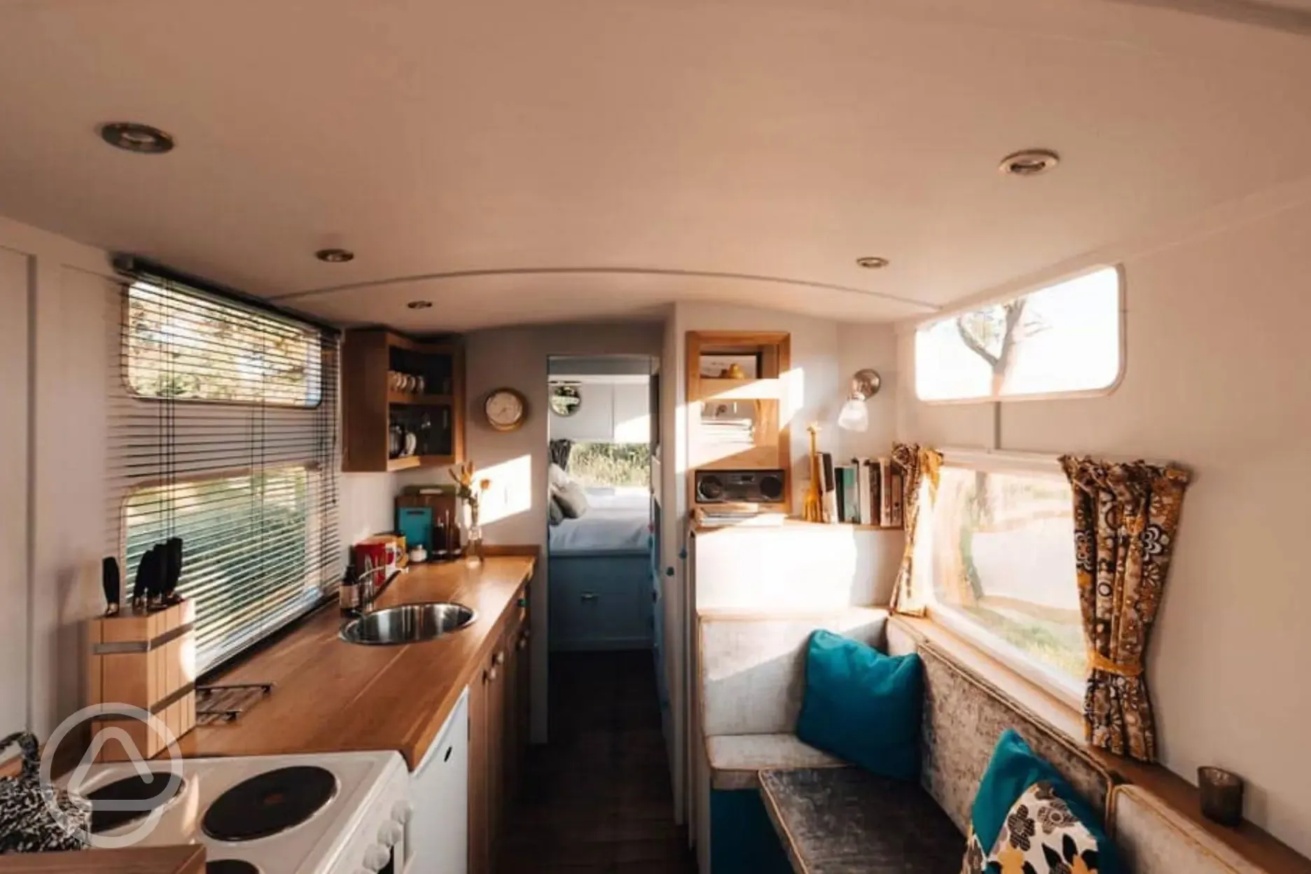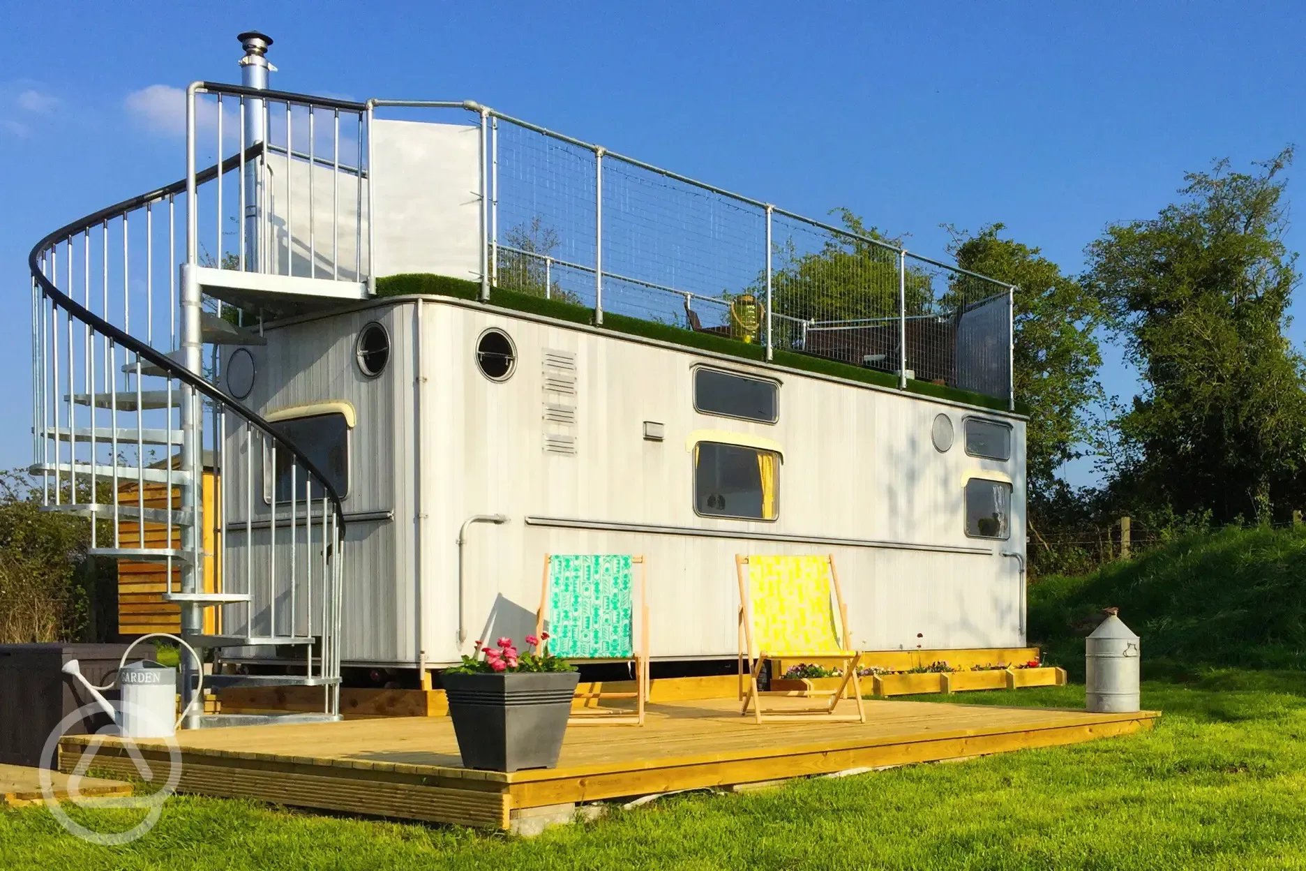 The Glamping Orchard is set on a family-run smallholding surrounded by farm animals and acres of space. Perfect for couples and families alike, all you need to do is sit back and enjoy getting back to nature in a quiet and peaceful setting. Enjoy thick soft duvets. Warm your toes on a hot water bottle under crisp bedding. Unwind in your wood-fired shower. Wake up to bird song. Collect fresh eggs for your breakfast. Take a horse and cart ride to the local pub. Go for a walk foraging for berries down the country lanes. Explore the area with the many things to do. And finally what better way to end the day than toasting marshmallows by the open fire and enjoying a glass or two? Nestled among trees still bristling with beautifully ripe Russets during summer, The Glamping Orchard offers a peaceful retreat in the form of two luxury abodes. There's a charming bell tent (sleeping up to five) adorned with bunting and lit by tea lights and fairy lights along with a wood burning stove. Belle is lovingly equipped with everything you could possibly need to cook, relax and sleep, taking the hassle out of traditional camping without losing any of the enjoyment. Your private kitchen hut is fully equipped and comes with a double burner gas stove and grill, cooking utensils, pots, pans, crockery, cutlery, condiments, cling film, foil, kitchen roll, bin bags, tea towels and washing up essentials. The washing up sink with running water is close to your tent and there's a cool box with ice packs that you can replenish from a freezer at any time. The other accommodation option is a spectacular restored 1950s Warwick Knight caravan. Believed to be one of only three left in the world, this 'Rolls Royce of caravans' has been renovated from a relic of the road to a staggering luxury caravan, featured on George Clarke's Amazing Spaces. Finished to the highest standard throughout, this unique caravan offers glampers a luxury stay with ample room for a family of four. The interior design, lovingly hand-crafted is fully equipped from integrated stereo to ingenious storage spaces, you'll never cease discovering the surprises it conceals. There's a fully equipped kitchen inside the caravan and with a perfect sense of countrified relaxation, all you need to do is sit back and enjoy. Whether you're enjoying a sunny day on the iconic roof garden, or a cosy drink warmed by the wood burner, you'll be hooked. By day, the Warwick Knight has plenty of living space and by night it transforms into the cosy blanket to keep you warm.