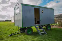 Shepherd's hut with a double bed, electric hob, fridge, utensils, crockery, kettle, and toaster. Linen provided, TV and DVD, pantry supplies, power points, picnic bench. Please note the hut is on a different site from the campsite.