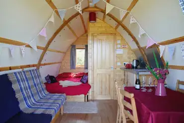 Insulated and double glazed wooden cabins with a panel heater, electric, fridge and a kettle. Bench type seating area with comfy foam mattresses which converts into a sleeping area for three. Sorry, no pets.