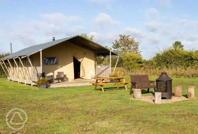 Each tent has a fully equipped kitchen with, gas hob, fridge with an icebox, microwave, kettle, toaster plus an ensuite toilet and shower, wood burner and fire pit/BBQ for outdoor cooking - so there's no need to share any facilities. There is electricity in the main living area and ensuite.