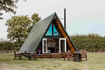 A-frame cabin with a double bed and two singles. Includes a kitchen, living room and ensuite bathroom. Pet free.