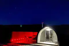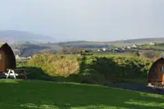 Private ensuite pods with amazing views. Equipped with a shower, double bed, kitchen, sofa, wood-burner and TV. Furnished patio with fire pit, BBQ and hot tub. No children or pets.