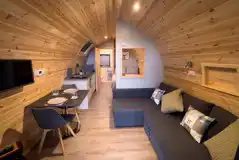 Large wheelchair accessible pod. Equipped with an ensuite wet room, kitchen, double bed, sofa, wood burner and TV. Private furnished patio with hot tub.