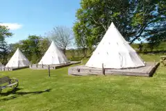 Modern Tipi tents, on raised wooden decks, with picnic benches on the grassed area outside. There's metered electric, 2 sockets, a light & a heater. Futon style beds are provided for families of 4, or 3 adults.