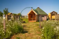 Rustic glamping tents made from timber, tucked away in a wildflower meadow. The tents are fitted with a double bed, two single beds, kitchenette and log burner.