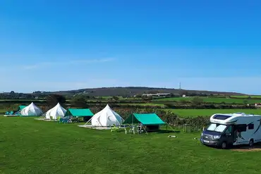 Farm campsite with sea views of Mounts Bay. Within ten minutes of Penzance, St Michael's Mount and Long Rock Beach.