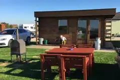 Glamping cabins with king-sized beds and either a single bed or built-in bunk beds. All crockery and cutlery are provided as are the basic cooking appliances including, a toaster, microwave, kettle and small fridge. Outdoor seating and a fire pit too.