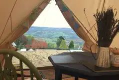 5m bell tents sleeping up to five on a double bed and double futon. Woodburner, electric, lighting and cooking utensils inside, firepit BBQ, private kitchen area, and seating outside. Bedding and towels for two provided. Shared facilities nearby.
