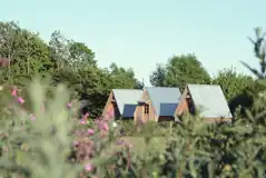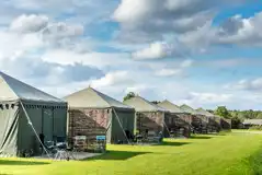 Glamping tents with a king size bed and two single bunks, bedding included. With lighting and sockets, a full-length mirror and clothes rail and access to a communal kitchen tent with a fridge, toaster and kettle, along with crockery and a large gas BBQ.