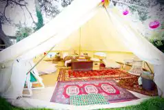 5m bell tents, sleeping up to six. Includes a fully equipped cooking area and fire pit. Bedding included for the double bed, please bring bedding for the children's single beds and your own towels. Up to two extra mattresses can be added. Pets welcome.