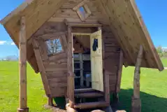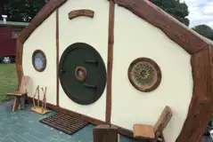 A hobbit inspired hut with two small double beds. Includes internal lighting, plug sockets, a picnic table and a fire pit. Bedding not included. Shared facilities are nearby.
