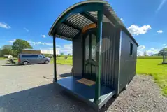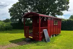 A shepherd's hut with a small double bed and a single bed. Includes internal lighting, plug sockets, a picnic table, a fire pit and a private veranda. Bedding not included. Shared facilities are nearby.