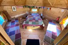 A small, witchy inspired hut with a raised double bed and two smaller single beds, best suited for smaller adults and young children. Includes internal lighting, sockets, a picnic table and a fire pit. Bedding not included. Shared facilities are nearby.