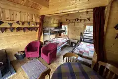 Two triple bunk beds, a double bed on the bottom and a single bed on the top, best suited for smaller adults or young children. Includes a wood burner, a dining area, a picnic table and a fire pit. Bedding not included. Shared facilities nearby.