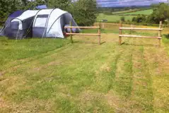 This is a peaceful location for people who want a quiet time in the country, with far-reaching views over three counties. Sheltered by the mountains, there is far less rain than most of the country. Most of their share of rain falls on Brecon instead, so the ground is green, but nearly always dry! The site is located just off the B4521 road from Ross-on-Wye to Abergavenny (gateway to the Black Mountains) and is spacious with over 20 acres of tree-lined stream and field. Beautiful spring colours make the site worth an early season look, while blackberries, plums and sloes in the autumn make that a good time to visit as well. All pitches are on grass, accepting just 10 caravans and around 30 tents. There is as much personal space as anyone could wish for and you can pitch near other vans and facilities, or go off to a secluded pitch under the trees, by the stream, or as you like. Serviced pitches offer water and electric hook ups to power lights, batteries, and fridges. The hook ups are not designed to support space heating, water heating and high wattage domestic appliances such as domestic kettles. Campfires are viewed as essential. You can bring your own fire basket or borrow one - and you can collect wood, or the site will supply it. In addition to the pitches, a ready tent available for hire. Everyone is welcome, from children and cats to dogs and horses, provided they do not bother other visitors. The site is particularly popular with those who want a peaceful time away, and also with cyclists making the trek from Land's End to John O'Groats. Visitors are asked not to play music, but rather to settle in and enjoy a very peaceful time. The site is not a good party venue!