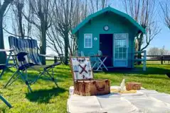 Sleeping up to two, these glamping cabins are supplied with electric, two single beds, kettle and small fridge. Outdoor patio furniture includes table and chairs. Please bring own bedding, towels, duvets.