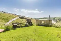Fully furnished yurt, to take camping to another level. Includes a double bed, double fold out bed and a log burner. Outside is a sheltered kitchen area. Pets welcome. Shared WC/shower facilities nearby.