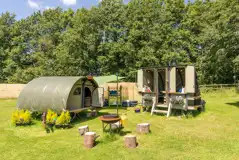 With glamping being more and more about the experience, The Paddock really delivers. You can lay your head in the simple perfection of a camping pitch with a roaring fire, or choose to take things up a notch with a set of uniquely quirky glamping Landpods. The pods are packed with individual details and offers the beds you need inside, an enchanting atmosphere, plus a chance to peel back the roof and watch the stars any time you fancy. Or you might fall in love with a spacious and beautifully furnished yurt, strewn with throw pillows, or even a big safari tent that can sleep up to 8! - the choice is yours. The safari tent includes a toasty wood burner, full double bed, bunk bed and sofa beds. Guests are treated to two separate bathrooms, two bedrooms and a kitchen with all the bits and bobs you'll need, plus a large living room with dining table. Outside is a fabulous fire pit and BBQ with log seating. Dogs are welcome with campers and in all glamping options except the Landpods.