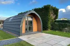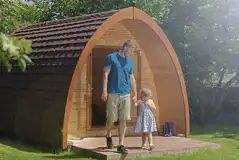 Pods with a double bed, sofa bed/bunk beds, bedding, bathroom with shower and a kitchen equipped with a kettle, microwave, fridge and toaster. Each pod has a TV, WiFi, central heating and an outside area with a dining table, chairs and a brick built BBQ.