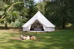 Two luxury bell tents, each set in their own private spot in a secluded part of the site. Inside the tents you'll find double beds with comfy bedding, a fold-away table and chairs, while outside there's a campfire for toasting your marshmallows.