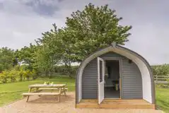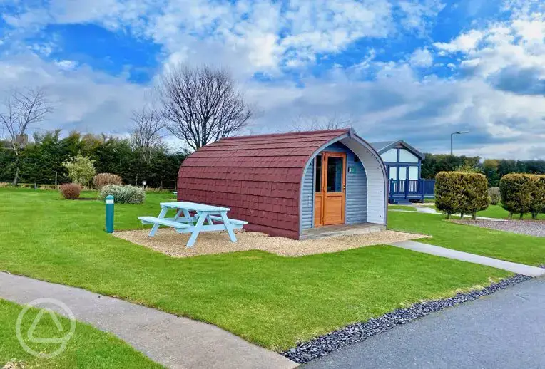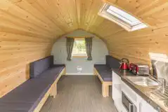 Stylish pod cabin for up to six people including two small children or four adults. Ensuite facilities, kitchen, Smart TV. Two sleep on mezzanine, two in dining area and two in the seating area. Includes electric, heater, private BBQ and picnic table.