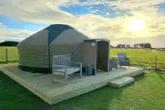 Furnished yurts with a double bed, microwave, sofa and storage. each yurt is situated on their own private decking with seating.