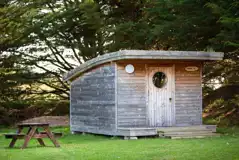 Eco cabin with benches that convert to a sleeping area. Features double glazing, insulation, heating, electricity and a mini fridge. Shared facilities nearby and dogs are welcome. Please bring all you would need for camping minus the tent. Dogs welcome.