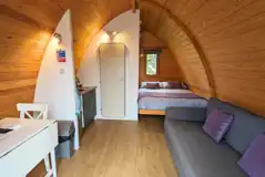 Eco pods furnished with a double bed and a sofa bed with bedding and feature underfloor heating and electricity. Each pod has ensuite facilities and a kitchen with a fridge, microwave and crockery. Please bring your own towels. Dogs are not permitted.