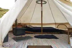 A bell tent with a double futon, a wood burning stove, gas camping stove and cooking utensils.