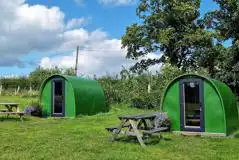 Camping pods with a double bed and small dining table. Bedding not provided.