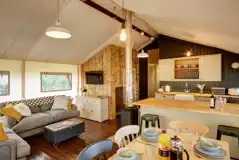 Spacious tents including two single beds or a bunk bed, two king size beds, fully equipped kitchen, a lounge area with a flatscreen TV, and a private bathroom. Outside, there is a patio, a fire pit, and your own hot tub. Dog friendly.