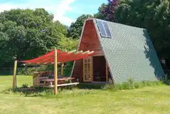A two-floor glamping chalet with two double bedrooms, a sofa bed and a living room. Outside is a sheltered kitchen and bench.